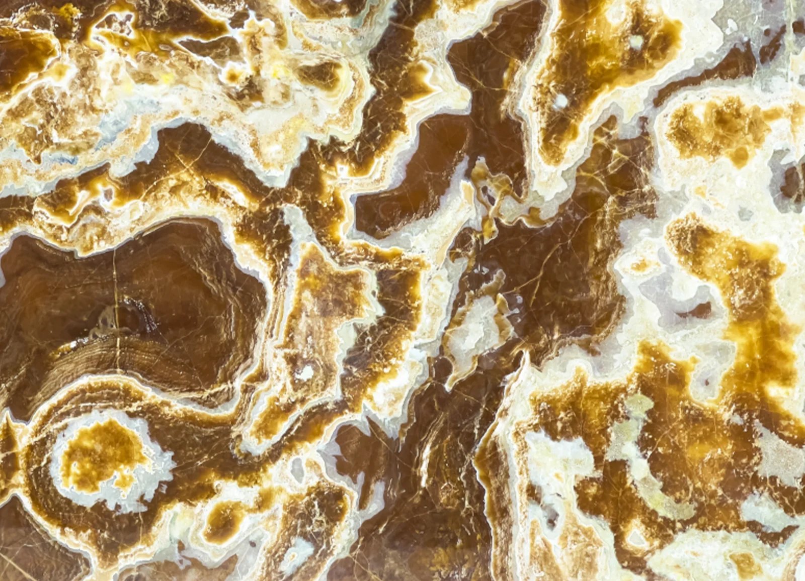This Onyx stone showcases a mesmerizing mix of rich amber, golden brown, and creamy white veining, creating a luxurious, high-contrast appearance. The polished finish accentuates its natural translucence, making it an exceptional choice for feature walls, fireplace surrounds, and decorative furniture pieces. The dynamic patterns and vibrant hues bring warmth and elegance to any interior space.